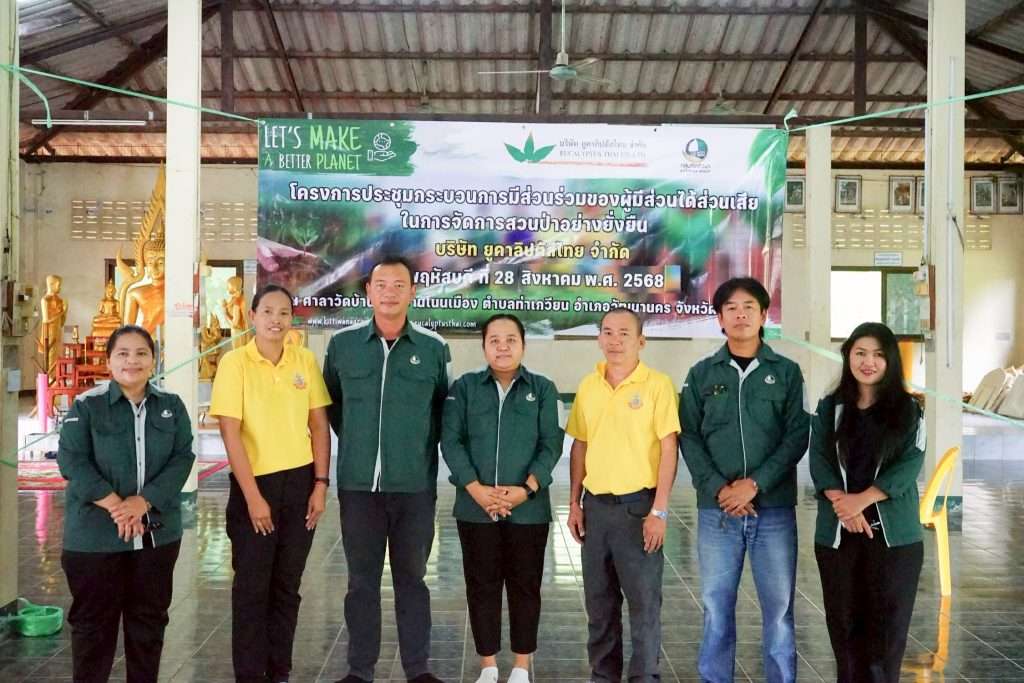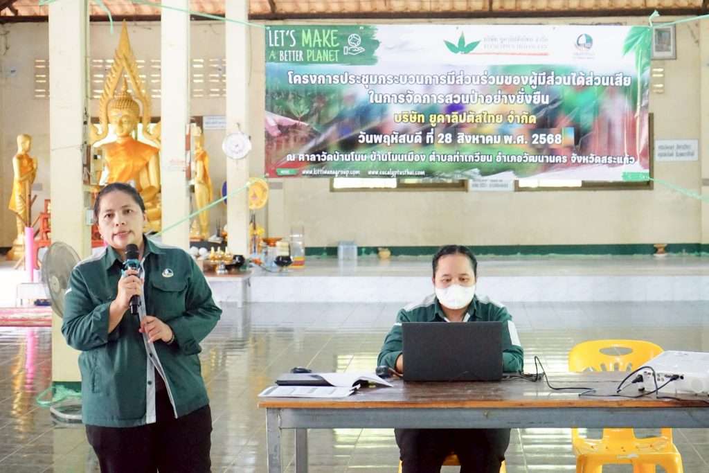 กิจกรรมเพื่อสังคมและชุมชน บริษัท ยูคาลิปตัสไทย จำกัด จัดกิจกรรมการอบรมหลักสูตร การป้องกันอันตรายจากไฟป่า และฝึกอาชีพให้แก่ชุมชนบ้านพร้าว วันที่ 21 ตุลาคม ที่ผ่านมา บริษัท ยูคาลิปตัสไทย จำกัด จัดกิจกรรมการอบรมหลักสูตร การป้องกันอันตรายจากไฟป่า และฝึกอาชีพให้แก่ชุมชนบ้านพร้าว วัฒนานคร โดยช่วงเช้ามีการบรรยายให้ ความรู้ในเรื่องการดับไฟป่า การป้องกันไฟป่า รวมไปถึงการอบรมให้ความรู้ในเรื่องการป้องกันไฟฟ้าลัดวงจรในบ้าน รวมถึงสัตว์มีพิษ ส่วนในช่วงบ่ายได้มีการสอนทำสบู่เพื่อใช้ในครัวเรือนให้แก่ชุมชนได้ฝึกทดลองทำอีกด้วย บริษัท ยูคาลิปตัสไทย จำกัด สนับสนุนไม้ยูคาลิปตัส ให้แก่กองร้อยทหารราบยานเกราะที่ 3 จังหวัดสระแก้ว วันที่ 2 ตุลาคม คุณอภิเชษฐ มนสีมา เป็นผู้แทน บริษัท ยูคาลิปตัสไทย จำกัด สนับสนุนไม้ยูคาลิปตัส 4 ตันพร้อมตะปู งบประมาณรวมกว่า 6,600 บาท ให้แก่กองร้อยทหารราบยานเกราะที่ 3 จังหวัดสระแก้ว เพื่อติดตั้งเกราะหุ้มรถสายพาน บริษัท ยูคาลิปตัสไทย จำกัด จัดกิจกรรมปลูกป่าในพื้นที่ ป่าชุมชนบ้านพร้าว อำเภอวัฒนานคร จังหวัดสระแก้ว วันที่ 21 กันยายน ที่ผ่านมา บริษัท ยูคาลิปตัสไทย จำกัด ได้จัดกิจกรรม ปลูกป่าและเพาะเชื้อเห็ดป่า ปีที่ 3 ณ ป่าชุมชนบ้านพร้าว อำเภอวัฒนานคร จังหวัดสระแก้ว รวมจำนวน 2 ป่าในการนี้ได้รับเกียรติจาก คุณพานิช มูลเชื้อ ผู้ใหญ่บ้านพร้าว กล่าวต้อนรับ และ คุณอภิเชษฐ มนสีมา กล่าวเปิดกิจกรรม โดยมีชุมชนและพนักงานเข้าร่วมอย่างพร้อมเพรียง กิจกรรมครั้งนี้ไม่เพียงเป็นการปลูกเสริมต้นไม้เพื่อเพิ่มพื้นที่สีเขียว แต่ยังได้เพาะเชื้อเห็ดป่าเพื่อให้ชุมชนสามารถใช้ประโยชน์เป็นอาหารและสร้างรายได้เสริมในอนาคต บริษัท ยูคาลิปตัสไทยจำกัด จัดกิจกรรมอบรมสร้างอาชีพให้กับชุมชนบ้านหนองน้ำใส วันที่ 19 กันยายน 2568 กลุ่มกิตติวนา ในนามบริษัท ยูคาลิปตัสไทยจำกัด จัดกิจกรรมอบรมสร้างอาชีพให้กับชุมชนบ้านหนองน้ำใส ณ ศาลาวัดหนองน้ำใส โดยมีคุณอภิเชษฐ มนสีมา กล่าวเปิดกิจกรรม ร่วมด้วย ชาวบ้าน นักเรียน และพนักงานร่วมกิจกรรม กิจกรรมครั้งนี้จัดขึ้นเพื่อมุ่งหวังให้ชาวบ้านมีทักษะและแนวทางในการประกอบอาชีพเสริม เพิ่มรายได้ให้ครอบครัว ภายในกิจกรรมครั้งนี้ มีการฝึกทำ ซาลาเปาไส้หมูสับและน้ำพริกนรกปลาย่างโดยมีคุณธีรารัตน์ ไกรชมสม นักวิชาการพัฒนาฝีมือแรงงาน จากสำนักงานพัฒนาฝีมือแรงงานจังหวัดปราจีนบุรี มาเป็นวิทยากรผู้ให้ความรู้ บริษัท ยูคาลิปตัสไทย จำกัด มอบเครื่องอุปโภค บริโภค ยารักษาโรค อาหารสด ไข่ไก่ รวมมูลค่า